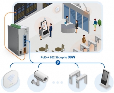Layer2 manageable DIN-Rail switch,industrial -20 to +60°C working temperature, 4 10/100/1000BaseT PoE PSE ports 90W 802.3bt, 2 undiversal SFP 100FX/GSX/GLX SFP port w/o SFP, VLAN tagging 802.1q, Q-in-Q, ,QoS 802.1p, trunking, RSTP, SNMP V2c, redundant input power terminal bloc 24-57Vcc Booster