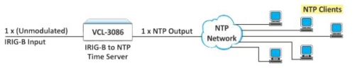 Le VCL-3086 se synchronise sur une entrée IRIG-B (IRIG-B 004 non modulé) pour fournir une sortie de temps NTP sur un port Ethernet 10/100BaseT. Ce port peut être utilisé pour gérer différents types de clients/esclaves NTP/SNTP au sein du réseau. Le VCL-3086 est équipé d'un oscillateur TCXO de haute précision assurant une horloge de maintien de la stabilité en cas d'indisponibilité du signal d'entrée IRIG-B ou de perte temporaire de réception sur un réseau totalement isolé.